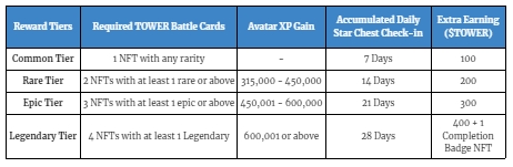 For example, players can get extra 100 TOWER tokens (the reward from only the Common Tier) from the event by checking in 7 days from the Daily Star Chest event and owning at least 1 TOWER Battle Card NFT of any rarity by the end of the month.